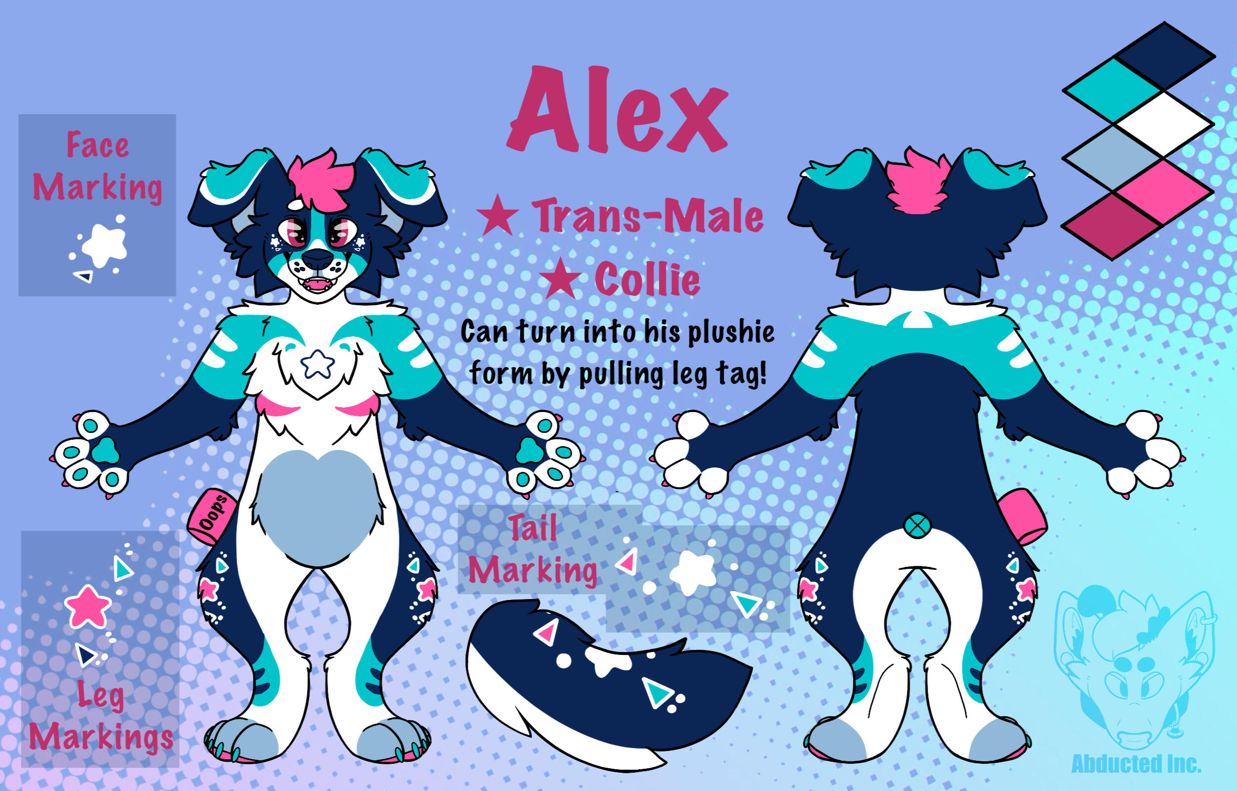 • Designed By: CinnamonServal• Fun Fact: Alex can turn into his plushie form by pulling his leg tag!• Debut Furcon: TBA
